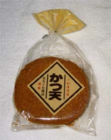 調べてみると、「かつ天」は、徳島県小松島市発祥のすり身加工食品なのだそうです。ちくわの材料である白身魚のすり身に、とうがらし、カレー粉などの香辛料を入れ、パン粉で揚げた練り食品だそうです。小松島の名物で、徳島県東部では非常にポピュラーな食べ物であり、地元ではスーパーやコンビニなどでも販売されているそうです。いわゆるローカルフードですね。