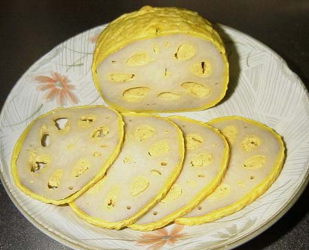 からし蓮根の発祥は、1632年、肥後藩主、細川忠利の頃だそうです。側近の者が、病弱だったお殿様を丈夫にしようと考え、増血剤として薬効のあるレンコンに栄養価値の高い味噌と和辛子をまぜた衣を付けて油で揚げて、献上したそうです。衣にはソラ豆の粉などを加え、時間が経っても柔らかく、美味しく食べられるように工夫がされています。栄養満点の料理で、お殿様も好物だったそうです。また、蓮根の穴が九つ揃っているのを、細川家の九曜の紋になぞらえて喜んだそうです。