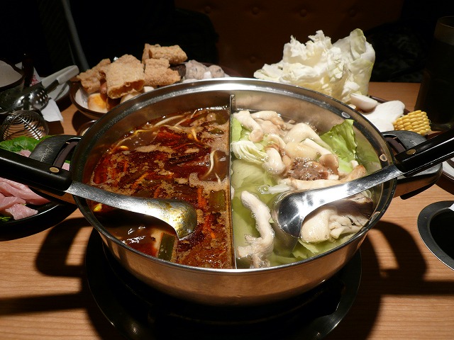 台湾では、一つの鍋の真ん中に仕切がある鍋を使います。そして、片方は激辛スープ、片方は辛くないスープが入れられており、辛いのが苦手な人でも食べやすいようになっています。そしてこの組み合わせの鍋料理を「鴛鴦火鍋(ユアンヤンフオグオ)」と呼びます。「鴛鴦」とは「オシドリ」のことです。金属製の丸い鍋で、単純に真ん中に真っ直ぐの仕切がある鍋のほか、仕切を太極の「陰陽」に見立てて湾曲させた鍋もあります。
