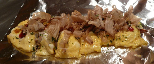 さらに見ていると、豚肉を生地の上に乗せ、塩、コショウを振りかけていました。また、その横に玉子を割って、コテで黄身をつぶしながら広げていきました。この薄焼き玉子を、先ほどの豚肉が乗った生地の上に乗せ、さらに薄く生地を塗って、両面を焼いて完成でした。この表面にソースを塗って、細い線状にマヨネーズをかけて完成でした。