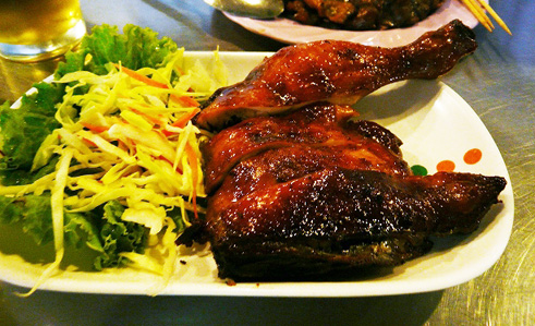 イサーン地方では、通常、焼き物料理には、炭火を使いますので、単に「焼き鳥」というよりも、「鶏の炭火焼」と言った方が、より正確でしょう。