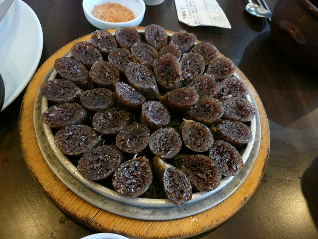 よく洗って、塩でもんだ豚の腸に、みじん切りにした野菜、モチ米、豚の血液、タンミョン(春雨)などの具を詰めて茹でます。蒸して調理する方法もあります。茹で上がったものは、輪切りにして粗塩や、味噌などをつけて食べます。もち米や春雨などによるもちもちとした歯触りと、豚の血が加えられることによって生まれた、独特なコクのある味わいが魅力で、鉄分などを豊富に含んでいることから、栄養価の高い食品としても知られています。