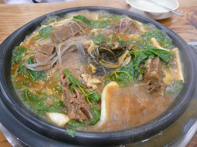 “カムジャタン”とは、豚の骨の中でも、しっぽと背骨を長時間ぐつぐつ煮込んだスープをベースに粉唐辛子とゴマ、ニンニク、味噌でピリッと辛みのあるコクのあるスープを作り、それにネギやエゴマの葉、下茹でをしたブツ切りのジャガイモ入れて煮た鍋のことです。エゴマやゴマの葉、さらに唐辛子を大量に加えているため、豚特有の臭みは全然感じらません。具を全て食べ終えた後には、残ったスープにご飯を入れて、炒めて食べます。